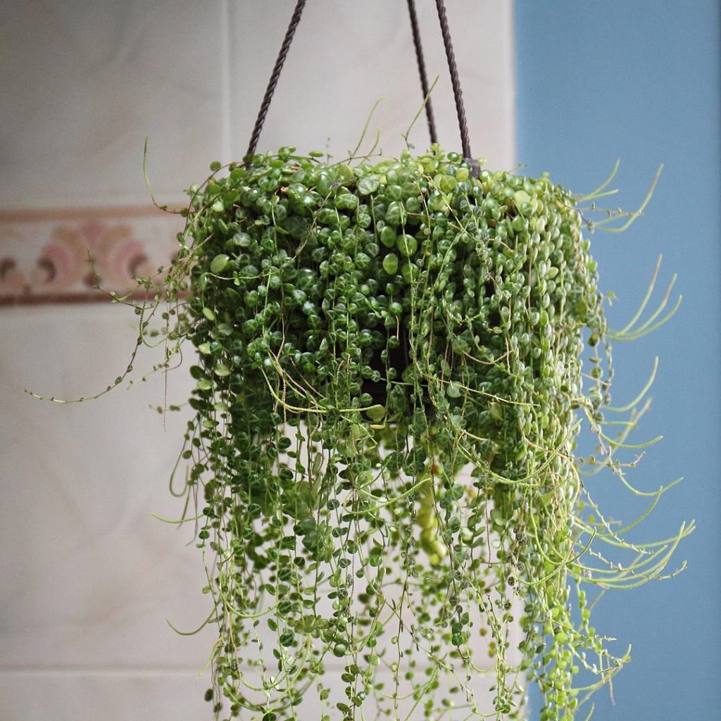 Peperomia prostrata – she sees the sky from an east facing window (to the right) and a large skylight (above). During some times in the year, I have to shield her from the sun with a curtain. I lift the pot to check how dry the soil is – it usually becomes completely dry after a week and a half.