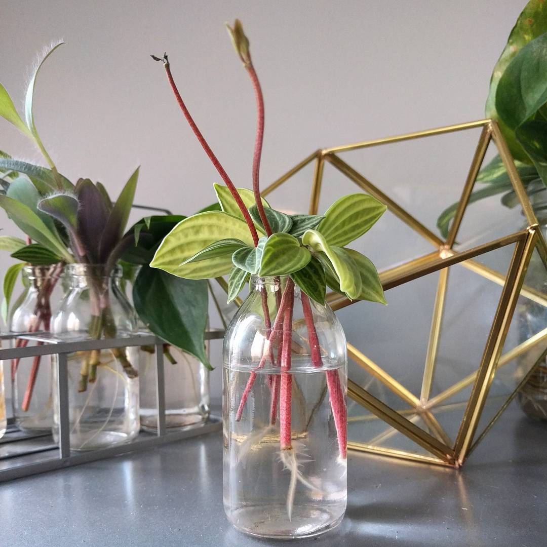 I always thought rooting could only happen close to leaf nodes but these Peperomia puteolata cuttings are proving otherwise. This is great news because it makes sticking them into soil easier as the long shaft of the stem helps to stabilize the cutting while more roots establish themselves. FAQ: you can transplant to soil whenever roots appear; some plants can even go directly to soil. On the other hand, some cuttings can grow indefinitely in water (@that_one_plant_guy ‘s specialty)