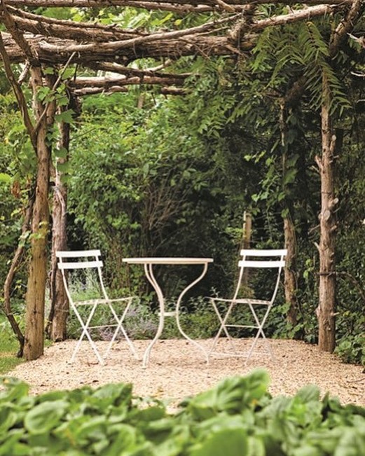 Morning coffee or tea? A cozy nook under a grape arbor, made from recycled locust trees, (bark still intact) can be found at a bountiful, four-season @oehmevansweden garden on Long Island.