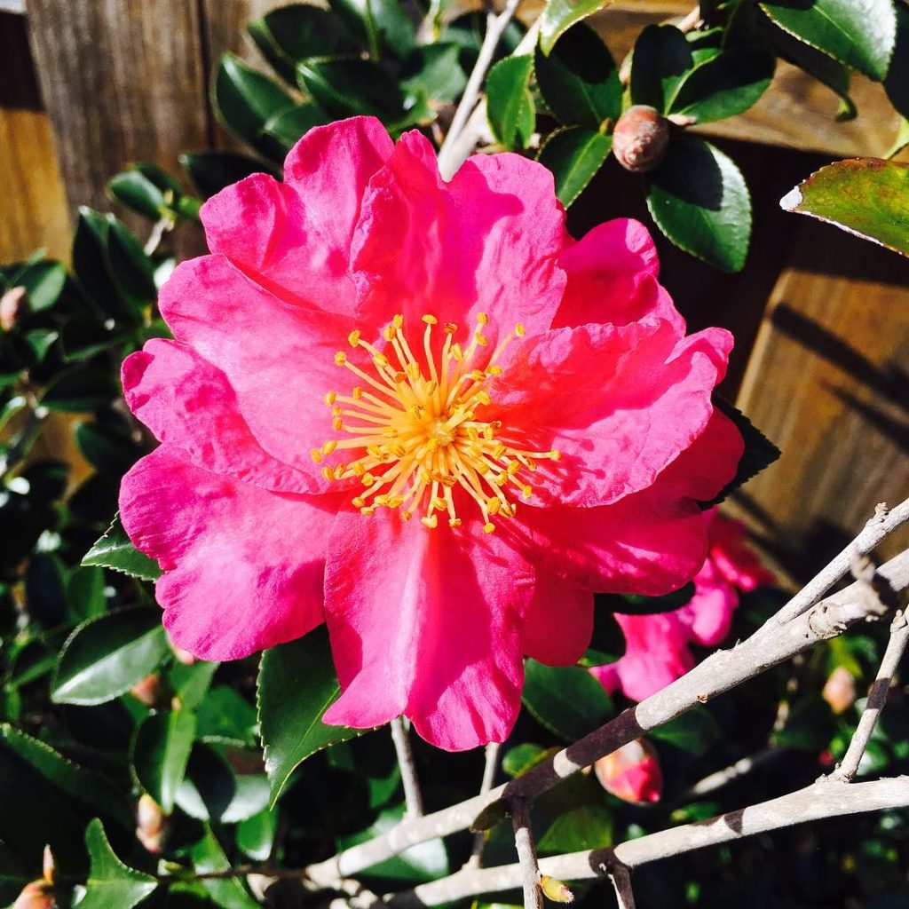 Camellia or rose? Looks similar to the rose blooms we posted yesterday but the round edges of the sepals on adjacent buds give it away as a camellia. #camellias #camelliabelt #thehorticult