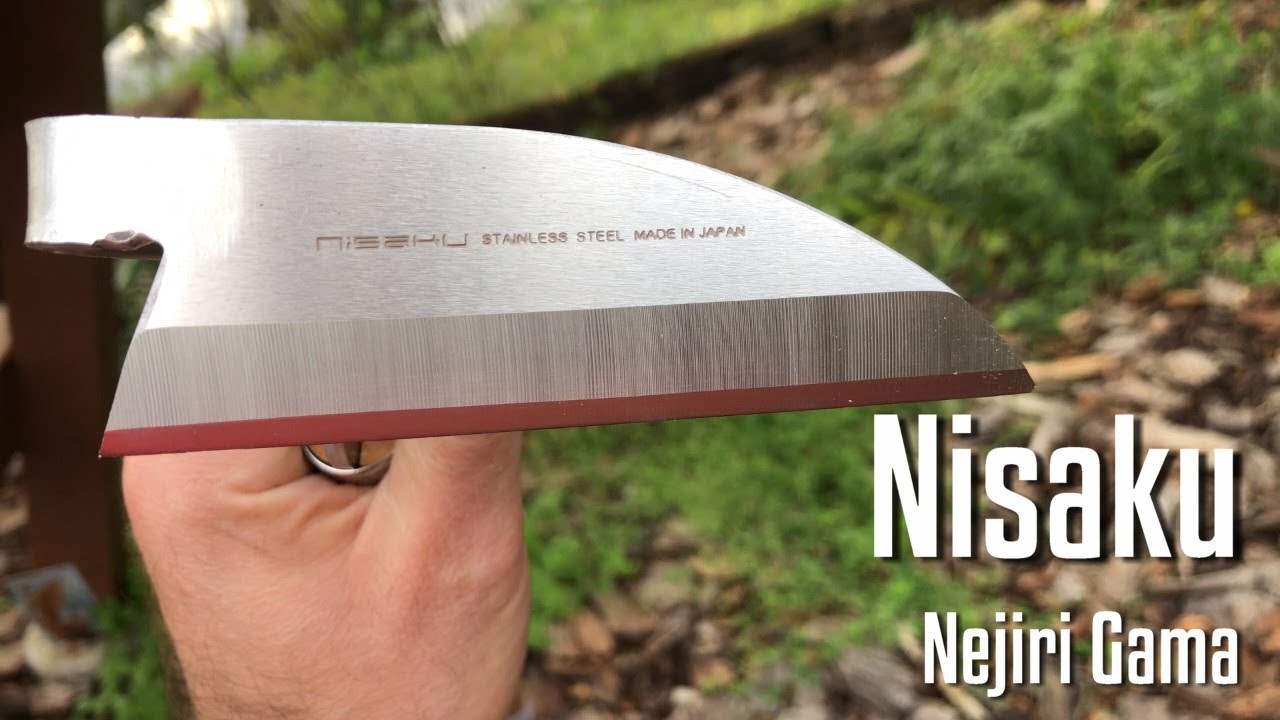 The Nisaku nejiri gama uses an angled sharpened stainless steel knife-like head to slice through the weeds. In testing, I found it worked better than a rake or a head in my mulched areas by cutting through the roots instead of just scraping the weeds.