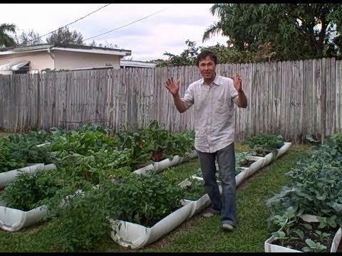 John from http://www.growingyourgreens.com/ goes on a field trip to a viewers house to share with you a backyard edible container garden over the ornamental lawn. In this video you will learn how easy it is to grow an edible gardening using plastic barrels that are cut lengthwise to form miniature raised beds that feeds this family in South Florida.