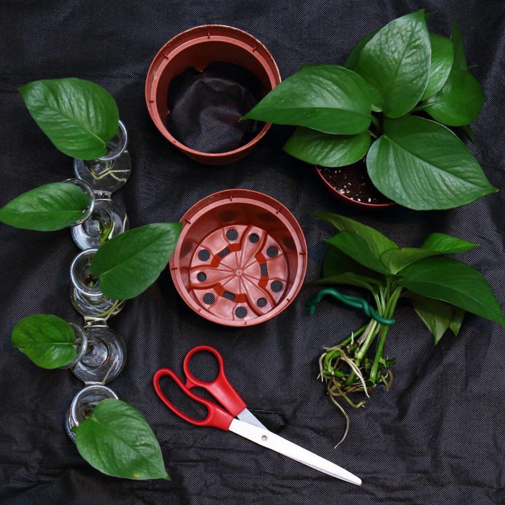 Transplanting cuttings: when new roots are about an inch long, you may transfer them to soil (but pothos and some other vines can grow in water indefinitely). I like to line a plastic nursery pot with a layer of landscape fabric to prevent soil from running out the drainage holes. The fabric can be easily cut roughly to the shape and size of your container’s base. Pothos aren’t too fussy with soil so I just use regular potting soil (sphagnum peat moss based) with some added perlite (helps with aeration and drainage) #houseplantjournal #pothos #propagationstation #plants #gardening #leaf #botanical #greenthumb #greenery #foliage #plantlife #botany #urbanjungle #greenfingers #houseplants #indoorplants #plantlove #plantstagram #indoorgarden #instaplants #plantsarefriends #plantlover #urbanjunglebloggers #indoorgardening