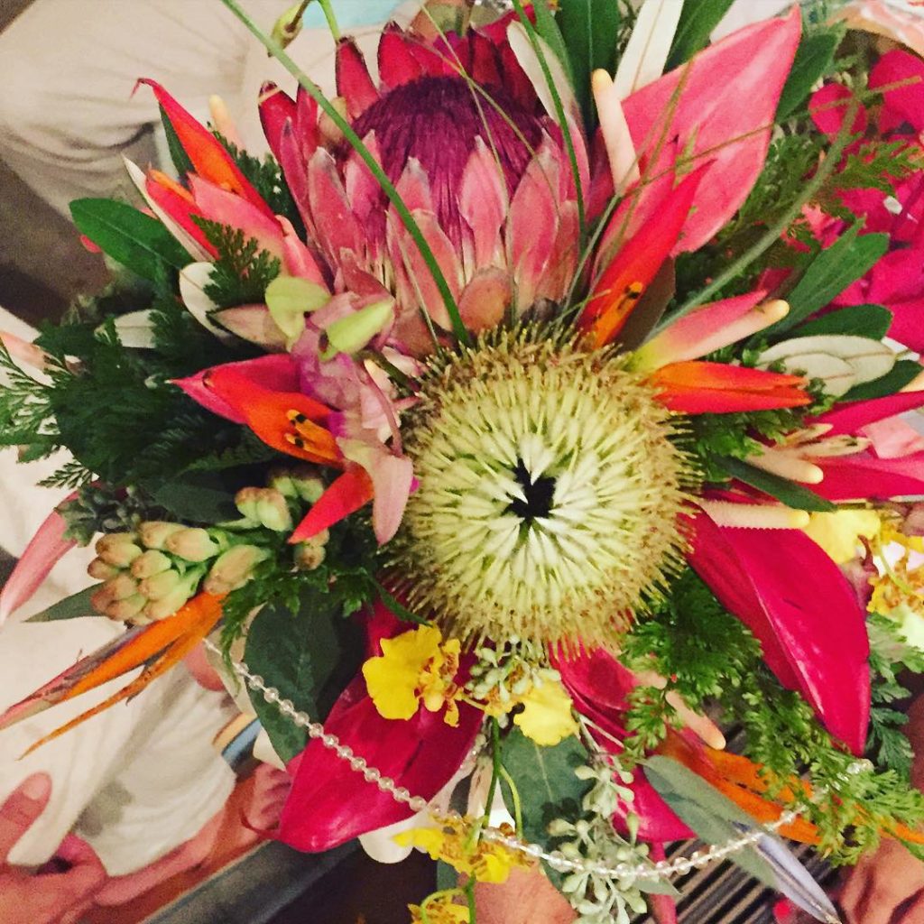 Swooning over the protea-mazing bouquet of beautiful bride @kelli_o! Thrilled to be dancing the night away in paradise with you beautiful lovebirds #growthebouquet #kona #printyhiwedding 🌺🌺💗
