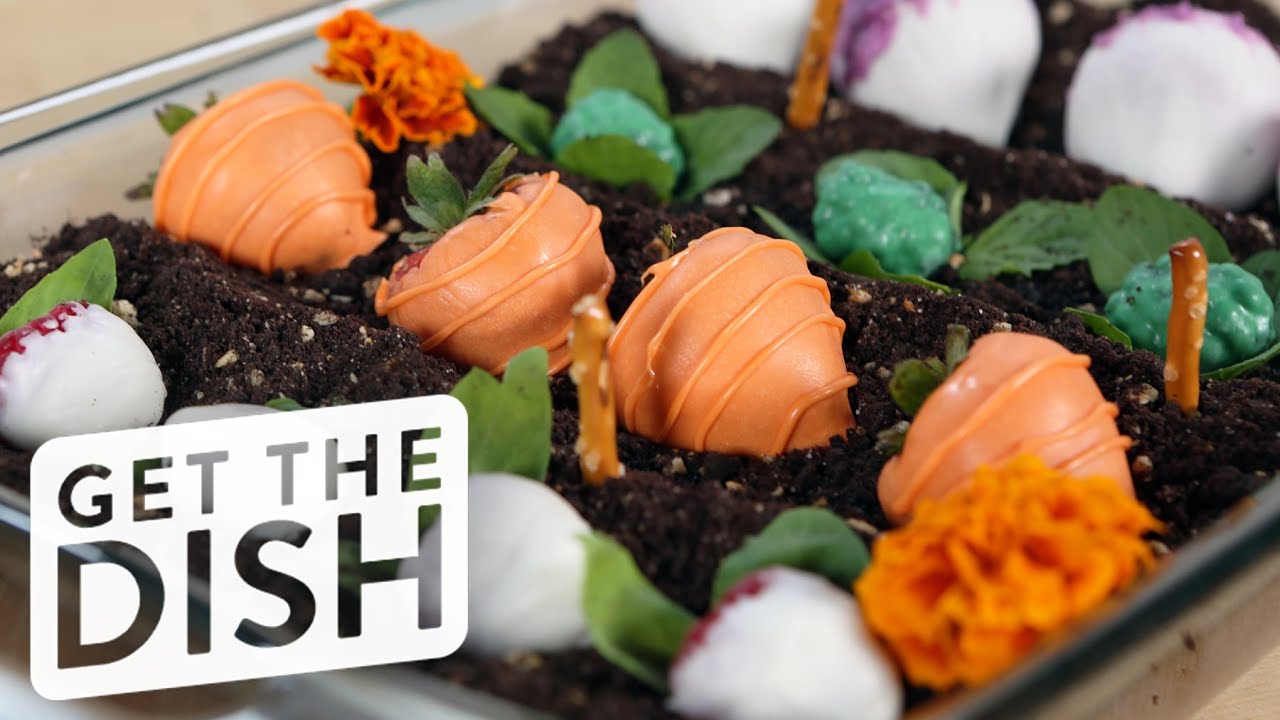 To assemble: Once the vegetables cool, add texture using a toothpick and score lines into the root veggies for an extra-realistic-looking garden! Next, arrange the “veggies” in rows in the cookie dirt and garnish with mint, basil leaves, edible flowers, and pretzel sticks. Enjoy right away or keep refrigerated until serving.