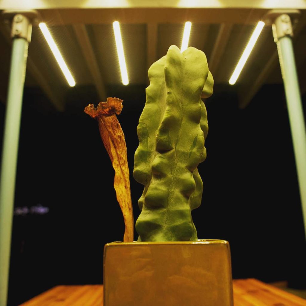 Caught these two monsters canoodling tonight…okay, the sarracenia is a cutting 👺! #monstrosetotempole #sarracenia #thehorticultgarden #pitcherplants #carnivorousplant #lophocereusschottiimonstrose