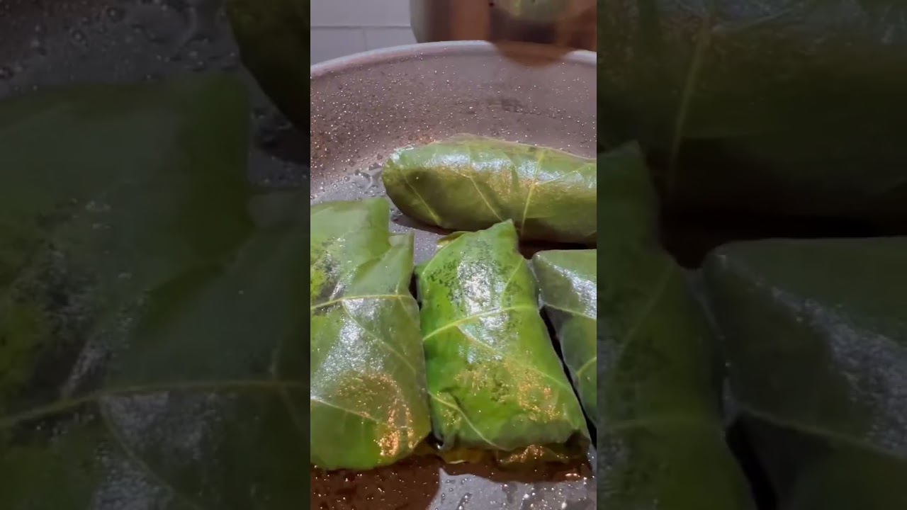 – Step 6: Take one leaf, shiny side down, and place 1 tablespoon of the mixture at the bottom (stem) end of the leaf. Fold both sides of the leaf towards the center, roll up from the broad bottom to the top, and place into a skillet. Repeat with all leaves, leaving no gaps as leaves are placed in skillet (to prevent from opening while cooking). Drizzle rolls with