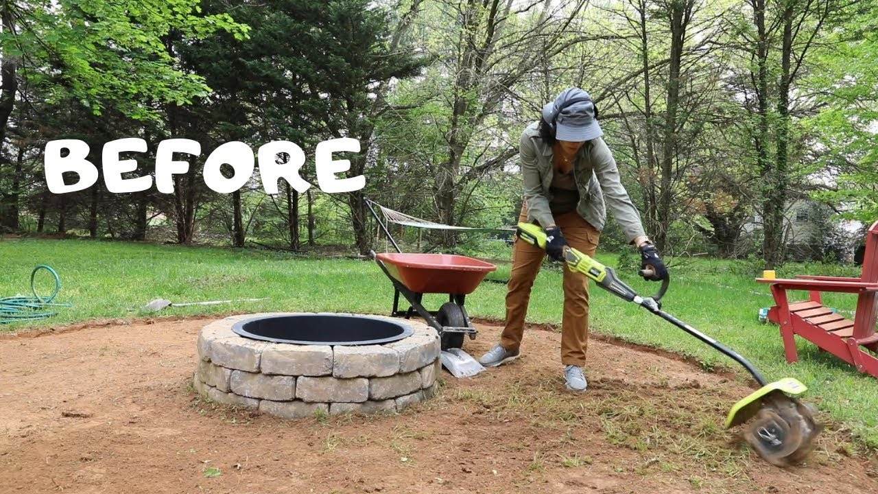 1:03 – Use a string trimmer to outline the fire pit seating area shape.
