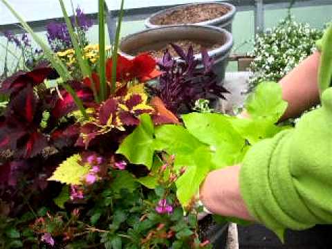 Plants: Ipomoea Lime, Ipomoea Emerald Lace, Ipomoea Sweet Caroline, Coleus Sedona, Coleus Freckles, Coleus Kingswood Torch, Dracena, Vinca Vine, German Ivy, Lotus Vine. 19″ planter filled with ProMix. Part Shade. Drought Tolerant. Designed at Westerose Greenhouse near Pigeon Lake, Alberta. For more container gardening ideas visit: www.westerosegreenhouse.com.