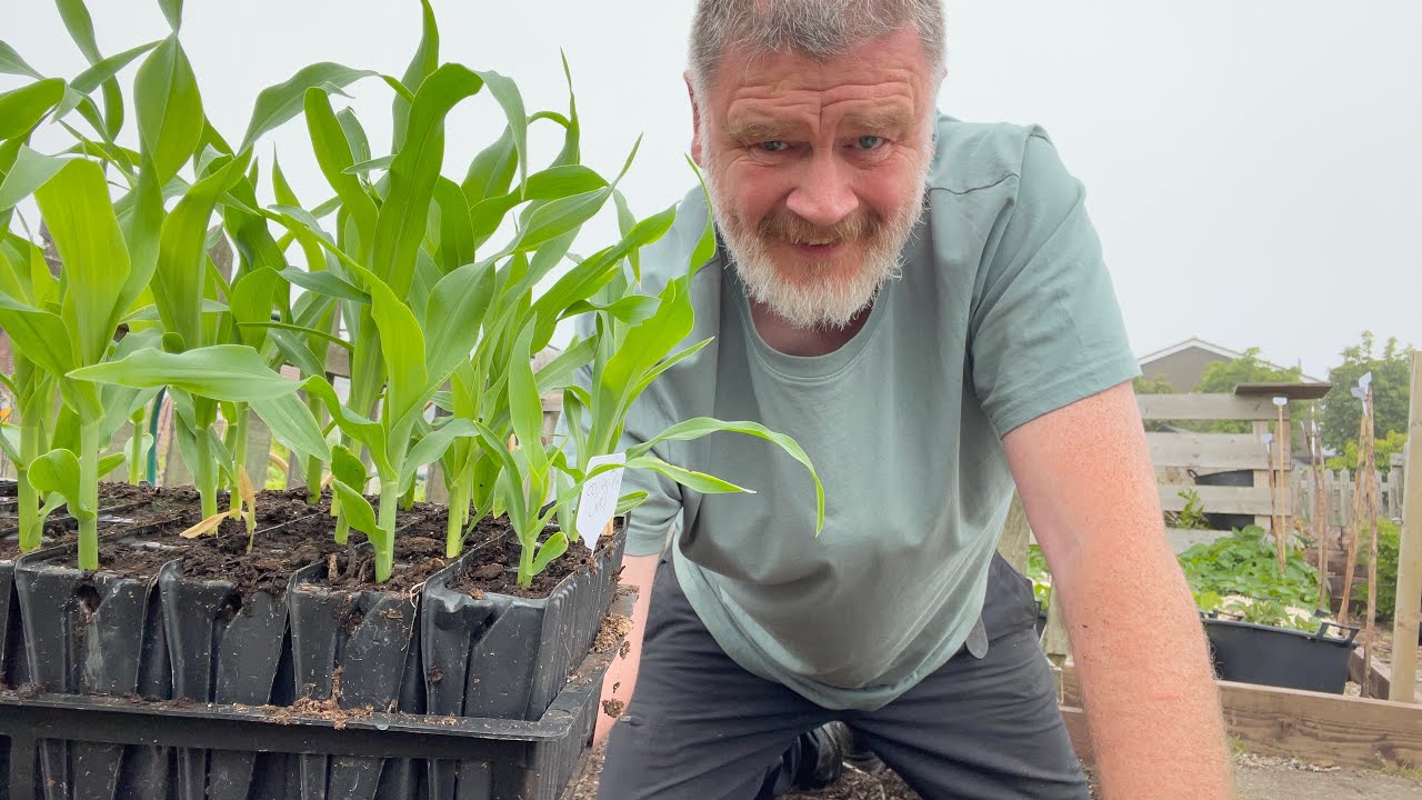 I don't think this would work for you in the allotment, but we plant three corn kernals per hole. They kind-of support each other as they grow and aren;t so apt to blow over here in our prairie's-edge garden.