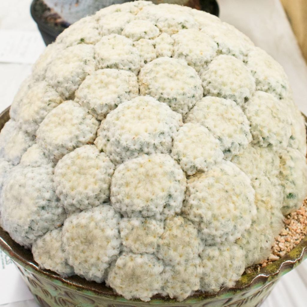 Head of cauliflower or Mammillaria plumosa? The genus is called what it is (and also nipple cactus) thanks to the spines that radiate from numerous areolae. #mammillariaplumosa #nipplecactus #cauliflower #lacssplantfestival #thehorticult