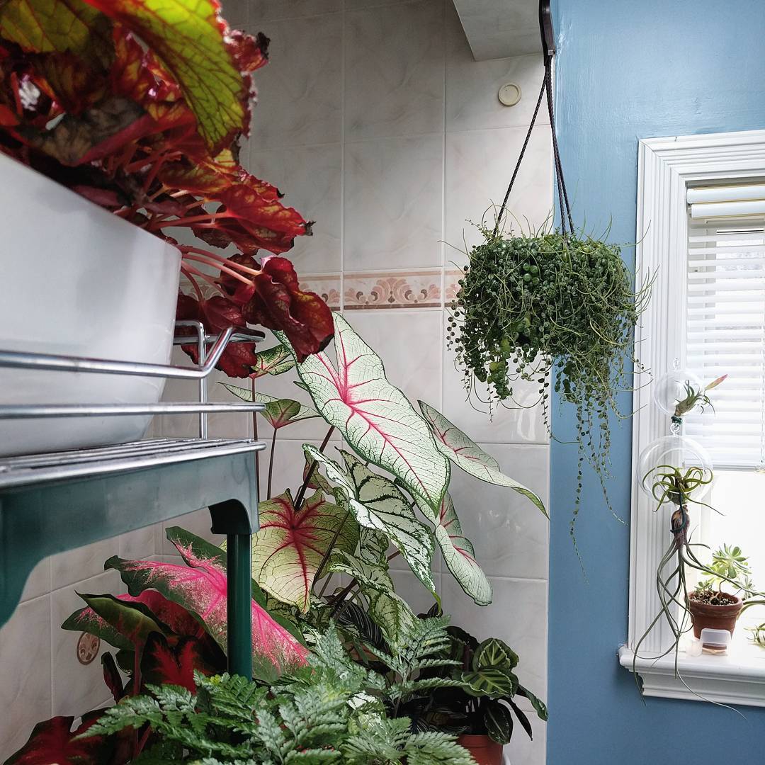 There are so many interesting angles in my little bathroom jungle: here we have a hanging Peperomia prostrata, some Caladiums, some Calatheas, air plants, Aeonium ‘suncup’, rabbit’s foot fern, and Begonia ‘Rex’ #caladium #peperomia #peperomiaprostrata #airplants #tillandsia #aeoniumsuncup #houseplants #indoorplants #houseplantsofinstagram #plantsmakepeoplehappy #plantsarefriends #plantparenthood #plants #plantlove #plantlife #plantnerd #plantsofinstagram #plantstagram #botanical #botany #greenery #greenthumb #instaplants #foliage #leaflove #leaf #urbanjunglebloggers #urbangardenersrepublic #jungalowstyle #airplants #airplantlove #tillandsia