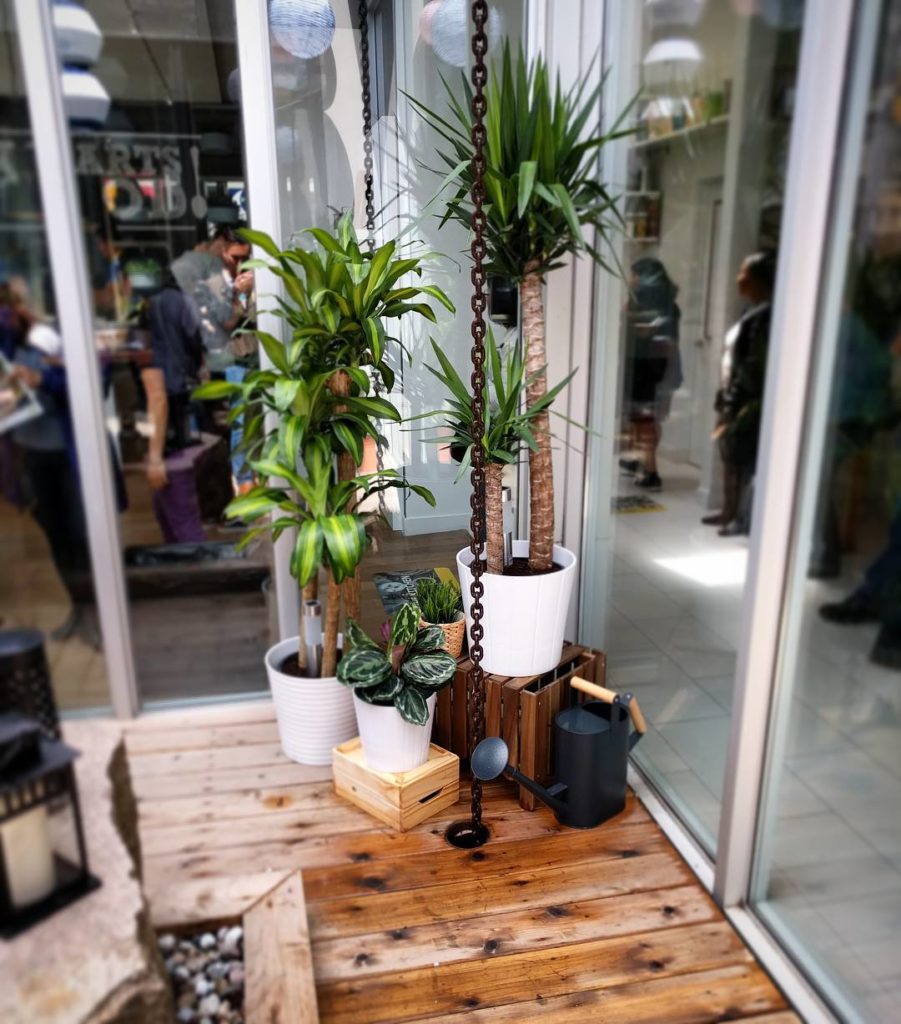 Here’s a great display for the purpose of plant identification (@ikeacanada #startfooding): the tall plant on the left is Dracaena massangeana (aka ‘corn plant’ because of its floppy leaves, resembling the actual corn or maize plant); the one of the right is Yucca elephantipes, with its sharp, stiffer, pointed leaf tips. These two plants start to look like each other when they grow for several years in poorly lit interiors: leggy, scraggly, dark green leaves. Give these guys at least 200 foot-candles! Oh hello, Calathea roseopicta! Also, here’s a “rain chain”: it guides rainwater from the roof to the drain below; a substitute for a downspout, usually found on the side of your house #cornplant #dracaena #dracaenamassangeana #yucca #calathea #calathearoseopicta #toronto #toronto_insta #yourtoronto #houseplants #indoorplants #houseplantsofinstagram #plantsmakepeoplehappy #plantlove #plantlife #plantsofinstagram #plantstagram #botanical #botany #greenery #foliage #leaflove #leaf #urbanjunglebloggers #jungalowstyle
