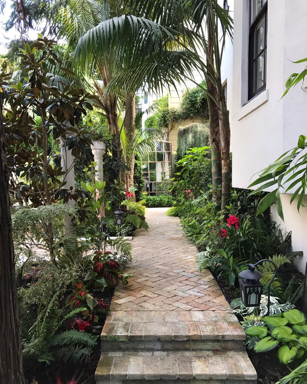 A small San Francisco garden designed by Davis Dalbok. The ancient brick were imported from overseas. The palms arching overhead and the antique mirror at the end make this walkway so much more inviting. . .