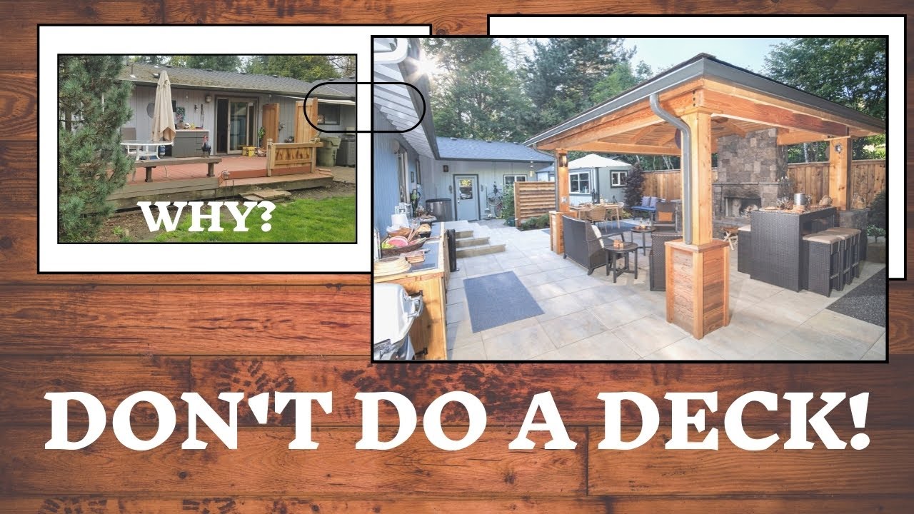 The question, “Should we keep the deck comes up all the time.” The answer, “Emphatically, no!” I want to show you why in this video. Rule #1, when a deck is close to the house, let’s say a single level house and it steps four steps down to a hard surface, don’t put a deck in that situation. There are other solutions like pavers vs deck – we’ll discuss in this video. And stay tuned to the very end ’cause I’m going to give you some bonus material. Other jobs of why you should not get a deck patio design. I hope you enjoy these decks to paver patio ideas and hope it will save you some money.