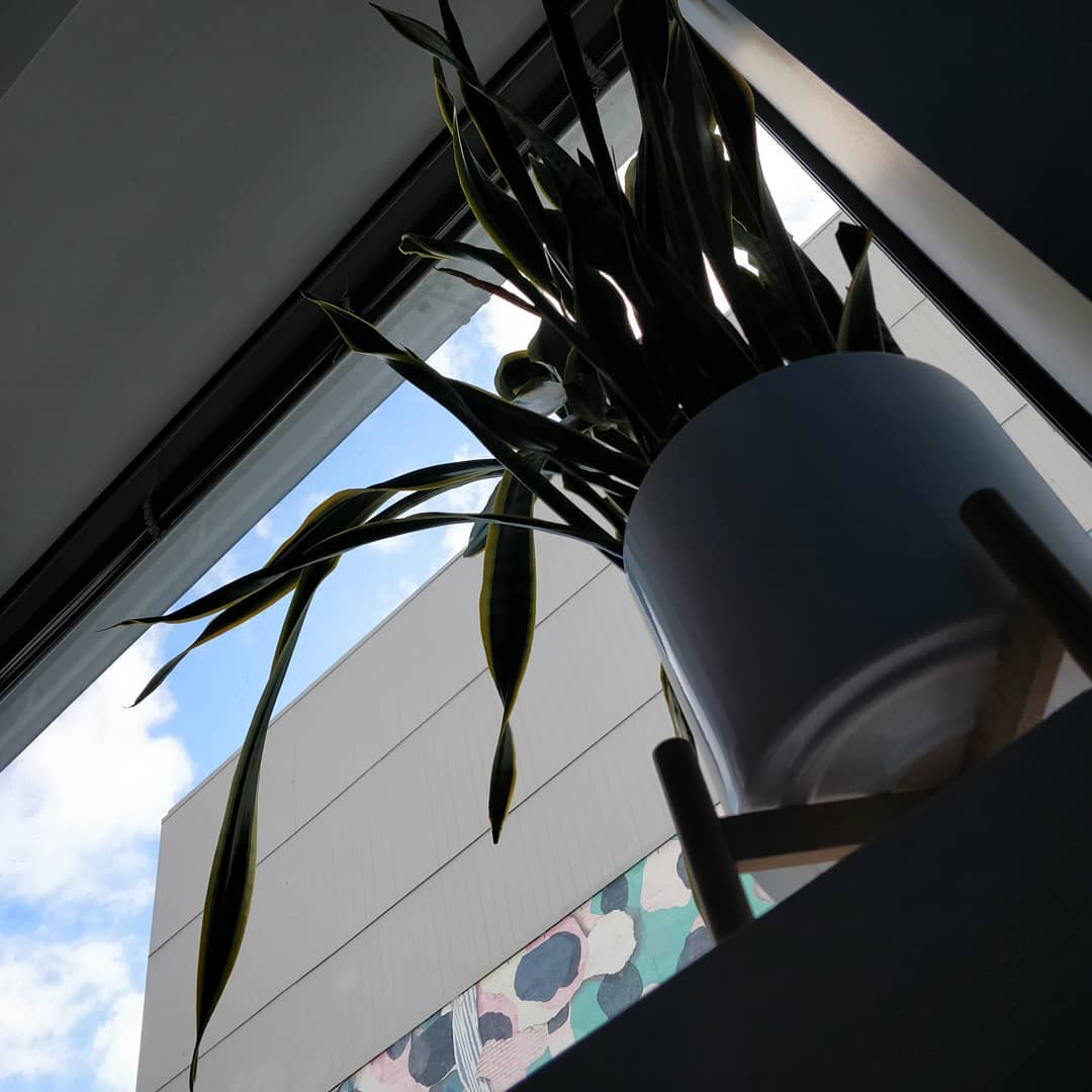 Am I concerned about bent snake plant leaves? Not really. After several years, there’s bound to be a few that flop over. My primary concern is #whatmyplantsees – terms like low-light and bright indirect light are too vague; I say “let your plant see the sky” because there’s no ambiguity or possibilities to misjudge – 📷 2) exactly what my plant sees: a patch of sky. I know that this plant will be fine in terms of light, the first step in all #plantlife