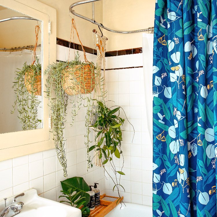 Showering with plants and our #justinaxschoolhouse Eucalyptus Nights shower curtain 🍃✨available at @schoolhouse #justinablakeneyhome #jungalowstyle (photo by @danaerolynhorst for the Jungalow) #patternsbyjustina