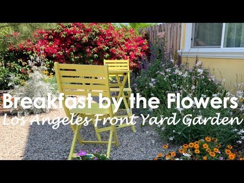 Springtime is for eating outside by the blooming flowers! While our backyard garden is filled with edible plants – fruit trees, herbs, berries, veggies, vines, shrubs and flowers, our front yard remains a flower/cactus garden. Come join me for a leisurely walk around followed by a breakfast with the little one – shredded pancakes topped with freshly-picked blueberries from the backyard garden.