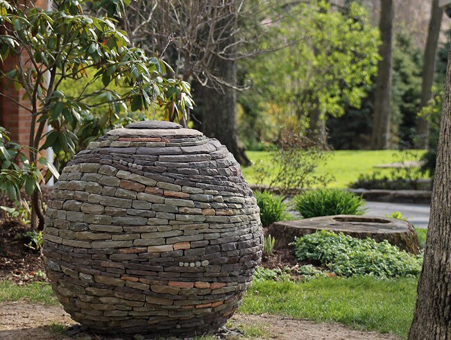 This 4-foot-diameter garden sculpture was created with various colors of stone stacked and woven together in a spherical pattern. “The sphere is about as universal of a shape as it gets. There’s a primal response to it, some fascination I can’t really describe,” says stone artisan Devin Devine.