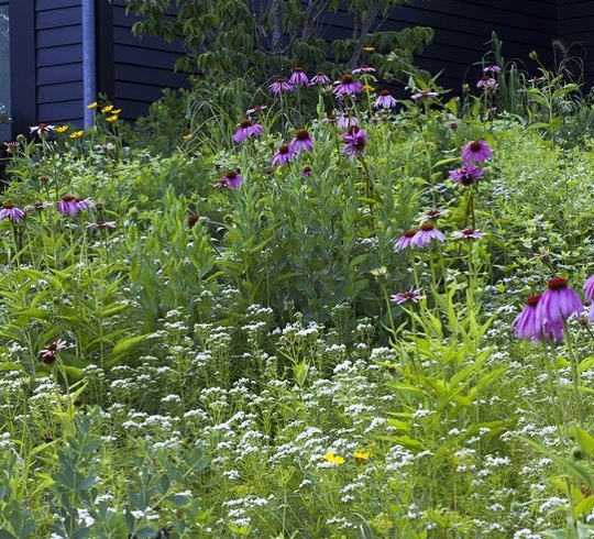 Design Tip: Plant densely, so there’s no space for invading plants to grow. Pictured: Echinacea purpurea (purple coneflower,) Pycnanthemum tenuifolium (mountainmint; white blooms), Baptisia australis (blue wild indigo; gray-blue foliage in center). Photo @saxonholt .