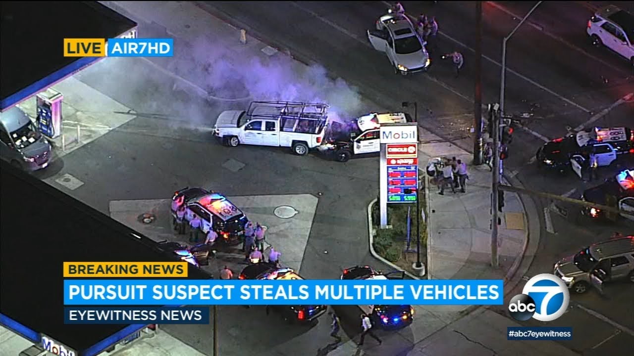 A man was arrested in the San Gabriel Valley after he led authorities on a dangerous chase in which he stole a van and a truck, and hit several other cars on the road. Full story: https://abc7.com/chase-police-pursuit-orange-county-anaheim/12435635/