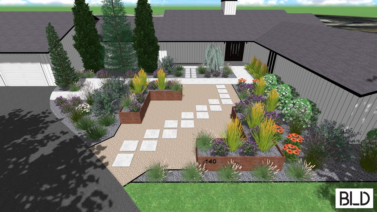 This contemporary, xeriscape design includes a variety of drought tolerant, colorful plantings that will attract pollinators and fits into the desert climate. The Corten steel planters and privacy screens add a nice accent of color and depth to the landscape and the stepping stones direct guests directly to the front door.