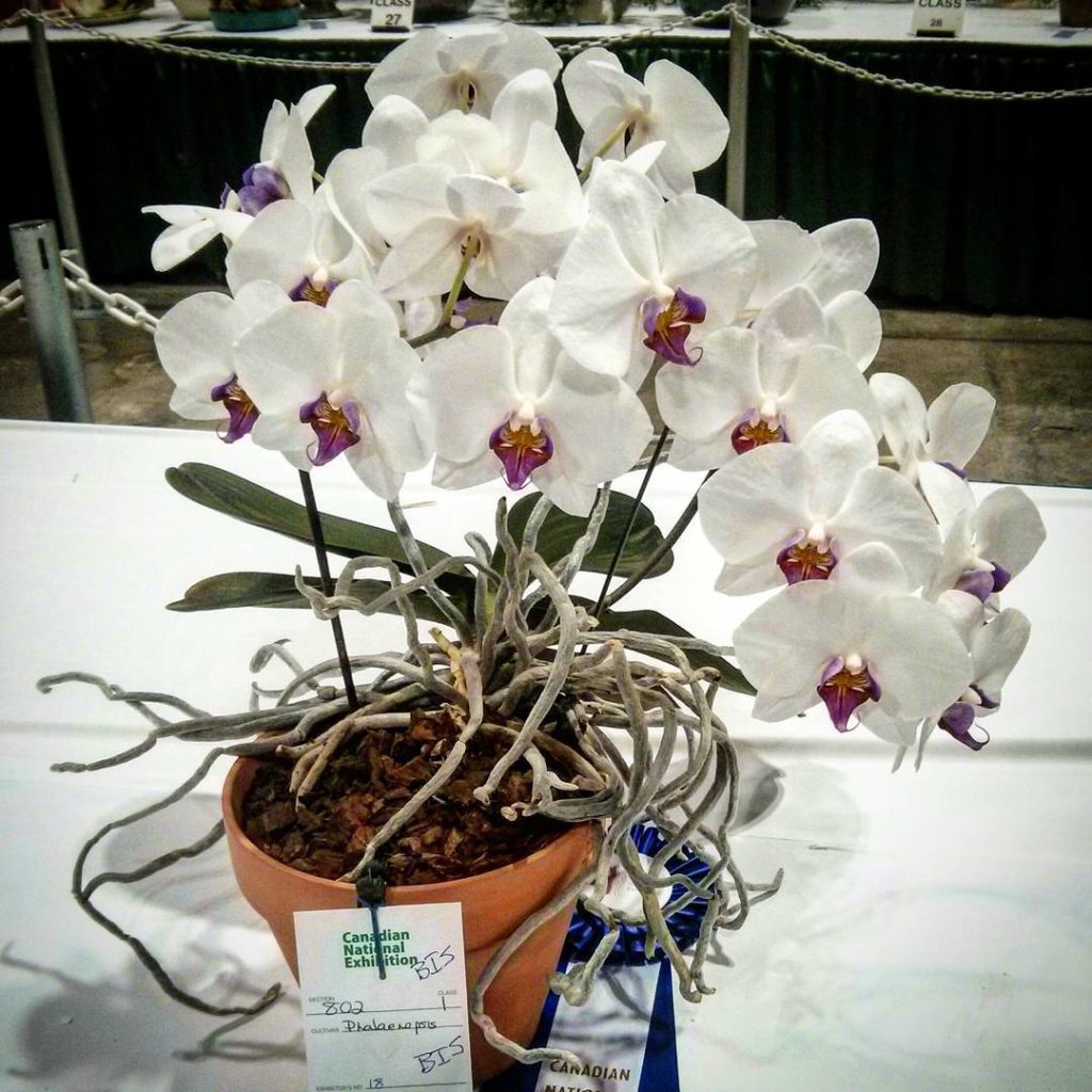 August 21, 2015 – this phalenopsis won the Best in Show award. Just look at all those aerial roots! #cne #cne2015 #phalaenopsis #orchid #plantcompetition #houseplants