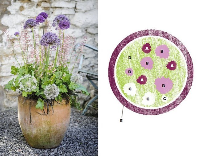 Planting Layout: A) Allium christophii; B) A. x hollandicum; C) A. karataviense; D) Heuchera ‘Strawberry Swirl’; E) Ophiopogon planiscapus ‘Nigrescens’. #springiscoming #gardeninspiration #designtip #gardentips #landscapedesign #containergardening #containergarden #gardendesign #springgarden #gardening #gardens #garden #allium #plants #planting