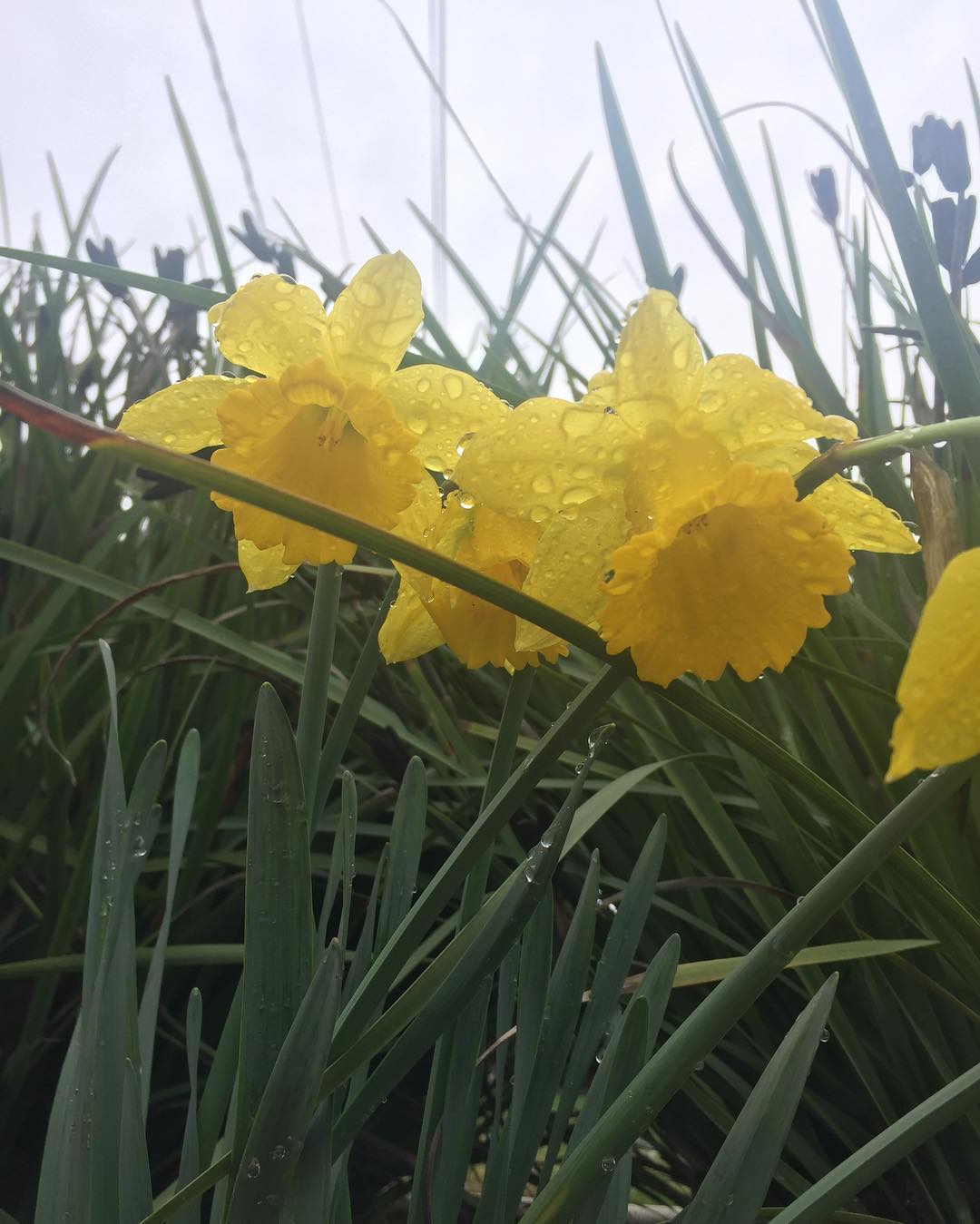 These little daffodils are getting a light shower ☔️ love the bright color on a gloomy day.