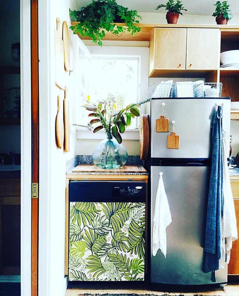 When @whitneyleighmorris used our #ajawallpaper to cover her dishwasher 😳🍃🌿🍃🙌🏾 #jungalowstyle #thetinycanalcottage #justinaxhyggeandwest