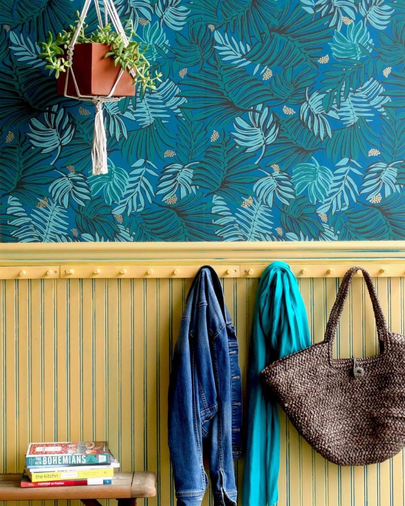 The most fun thing about designing home products is seeing how different people make them their own. This is from @colorhousepaint — the color on the wainscoting is ASPIRE .05 with a wash of DREAM .06. The macrame plant holder is from @emily_katz’s @modernmacrame and the wallpaper is our @hyggeandwest #ajawallpaper in teal. #jungalowstyle #justinaXhyggeandwest