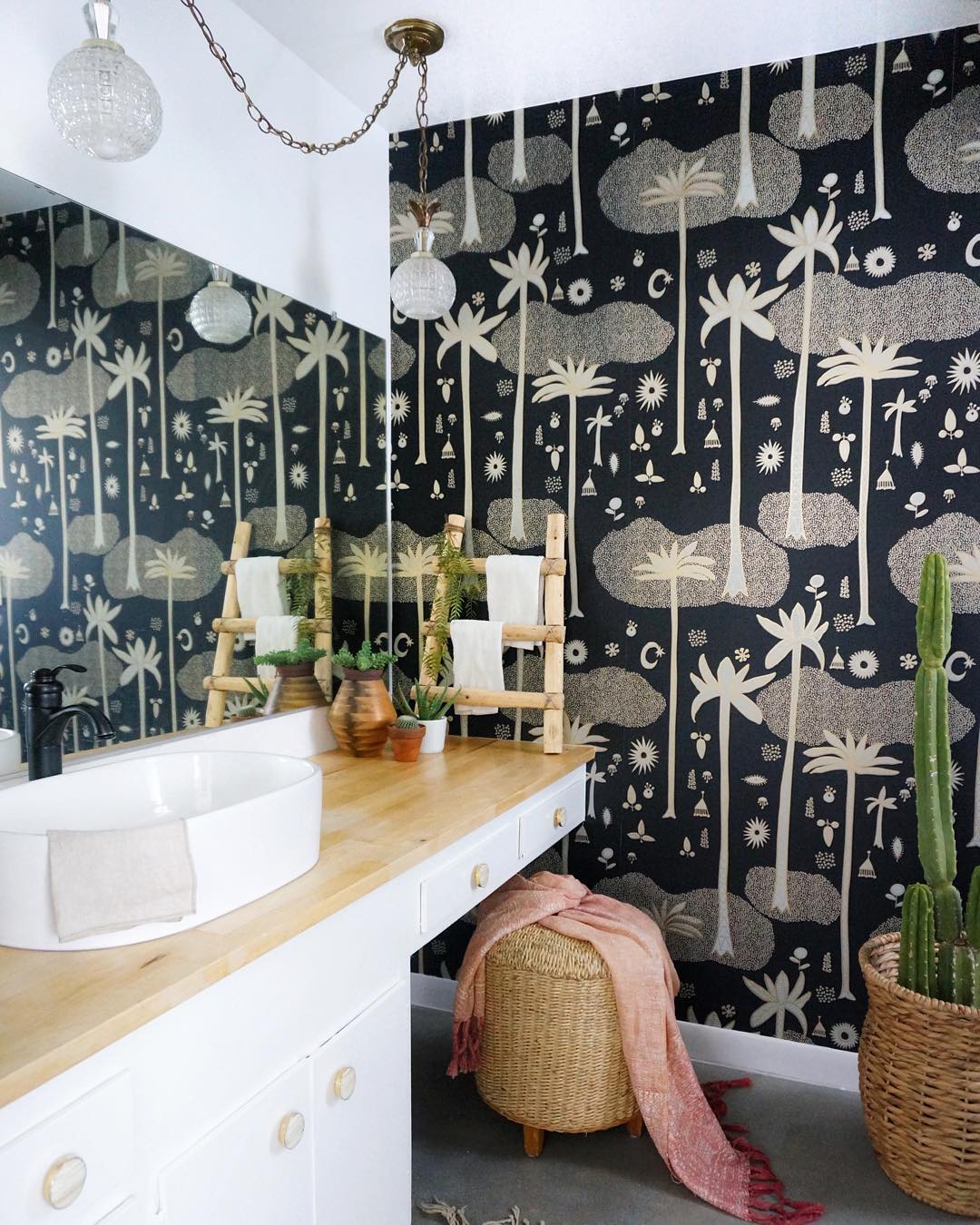 The desert in Joshua Tree got even more cosmic when @casajoshuatree installed our #cosmicdesertwallpaper in her beautiful bathroom!! Don’t you wanna be surrounded by ✨🌴🌙✨💫🌴 while you 🚽 and 🚿!?! 🙄🤓😜 (photo by the inimitable @whitneyleighmorris ) #jungalowstyle #justinaxhyggeandwest @hyggeandwest