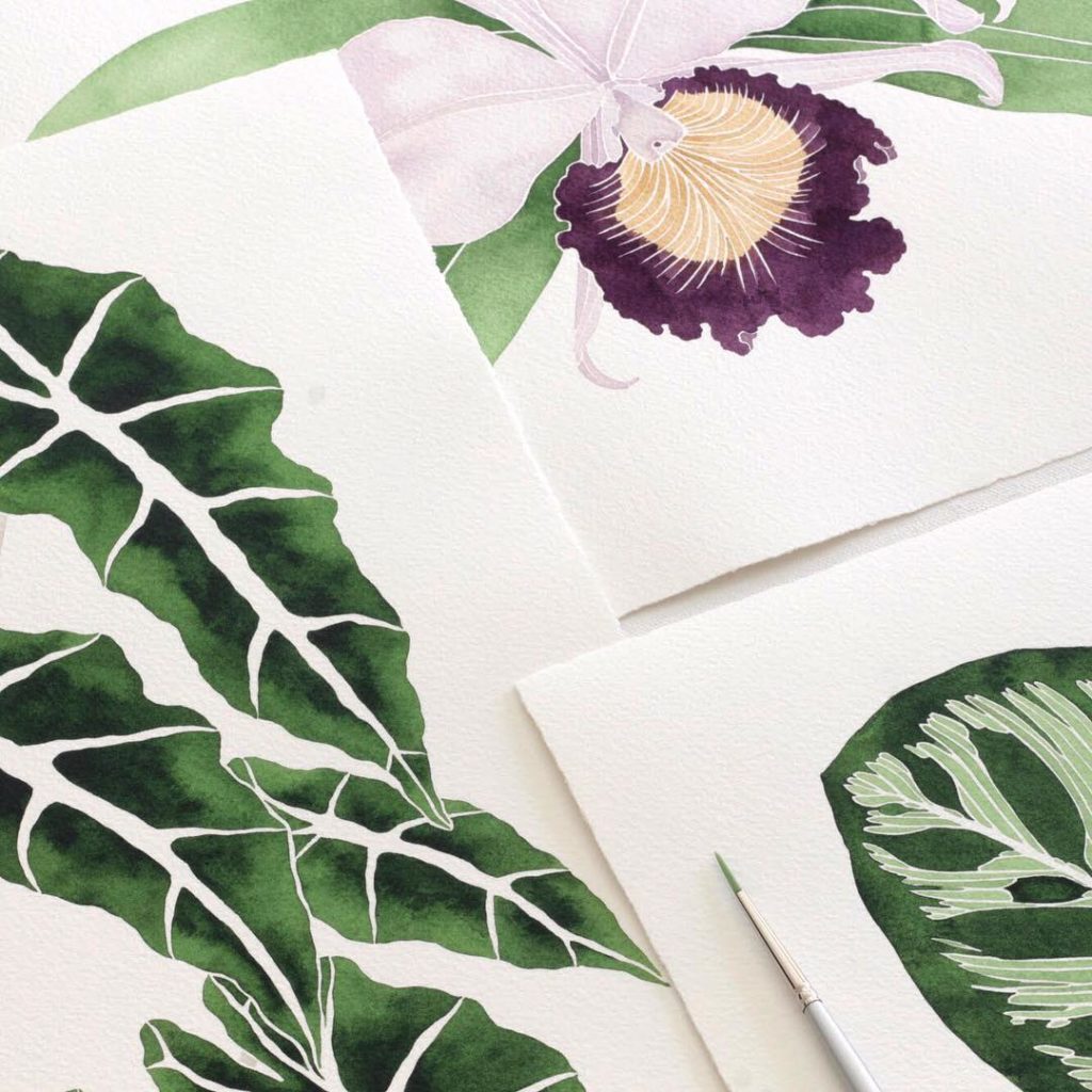 Photographing my Alocasia, Laeliocattleya Orchid, and Calathea paintings today💚