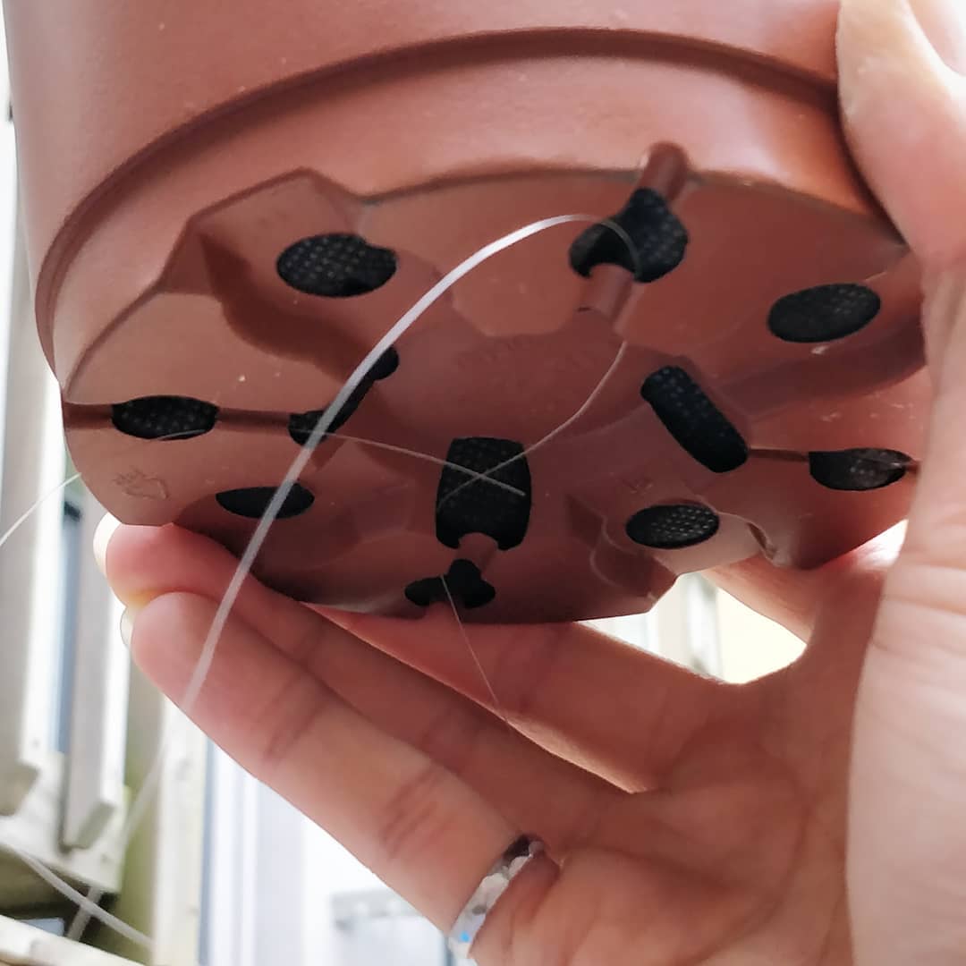 📷2️⃣ I threaded a fishing line through the base of the pot for…