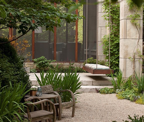An ipe swing bench and curvy chairs along a winding gravel path make inviting spots for relaxation. See all 10 trends from @pamdigging on gardendesign.com