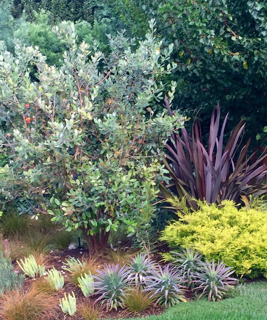 What a lovely combination of plants. A small pineapple guava tree surrounded by Phormium, small ‘Blue Boy’ yuccas, and the wonderfully fragrant Coleonema pulchellum ‘Sunset Gold’ at @pinehouseediblegardens