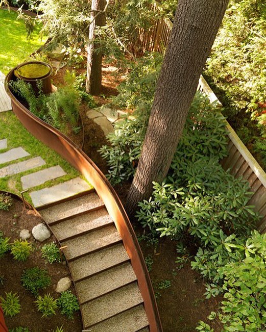 Can you spy the “hand rill” (hand rail that functions as a water rill)? It’s our favorite part of this shaded garden design by Julie Moir Messervy Design Studio. Photo Susan Teare.