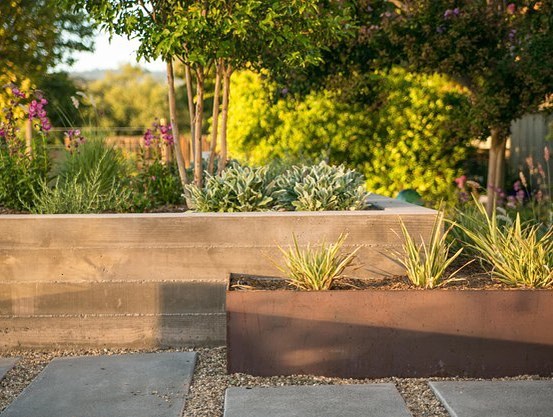 Design Tip: Swap stucco raised planter beds for board-formed concrete walls in the garden for warm color and attractive texture.
