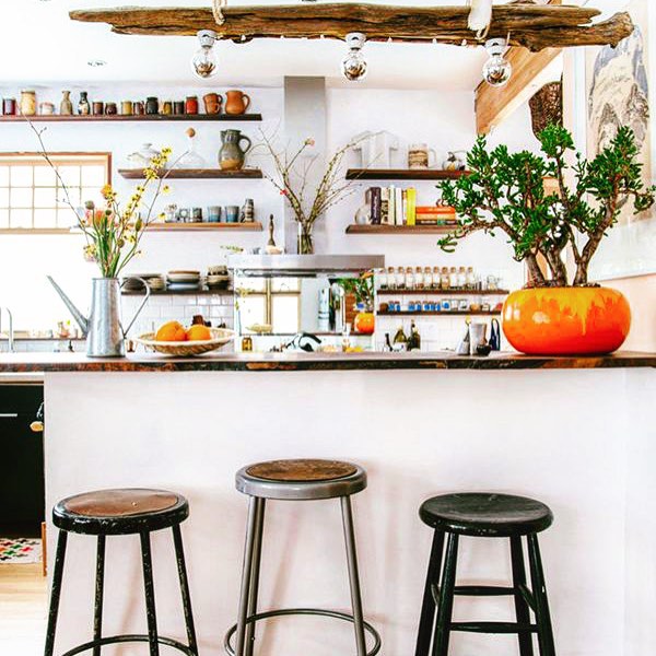 This inspiring kitchen from the home of @emily_katz and @GoldenRuleDesign was a whole DIY situation–we can’t get enough of the open shelving, that driftwood light fixture and of course that Jade plant in that fiery pot!😍🌿 from #TheNewBohoBook 📷 @dabito #Jungalow #BohoKitchen #BohemianKitchen