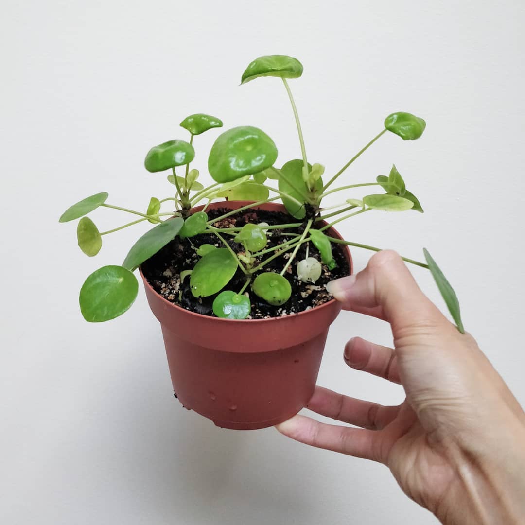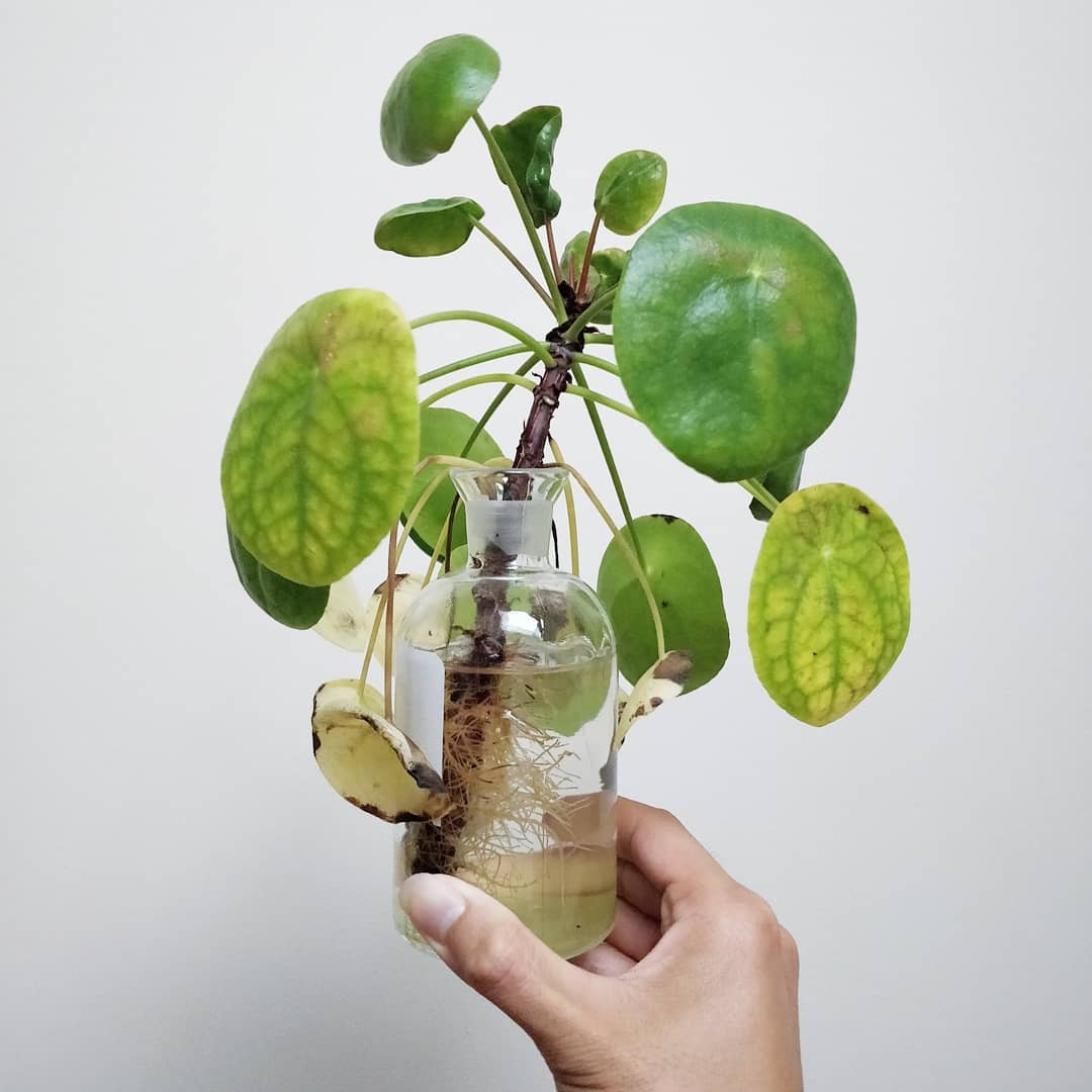 In an effort to save my original Pilea peperomioides plant (just over 2 years old), I cut the main stem and stuck it into a bottle around the beginning of July. Today, I found it rooted but hanging on for dear life. I’ll pot it up once I’m more settled in and see how it goes. 📷2️⃣ The stump has grown a new stem and daughters 5 and 6 are doing fine.