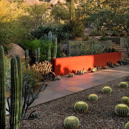 Scottsdale, AZ landscape by designer Steve Martino ☀️🌵🌵☀️ See desert garden ideas on gardendesign.com #gardendesign #desertgarden #garden #cactus #arizona #scottsdale #desert #cactusgarden #stevemartino #phoenix #saguarocactus #strawberryhedgehogcactus #staghorncholla #organpipecactus