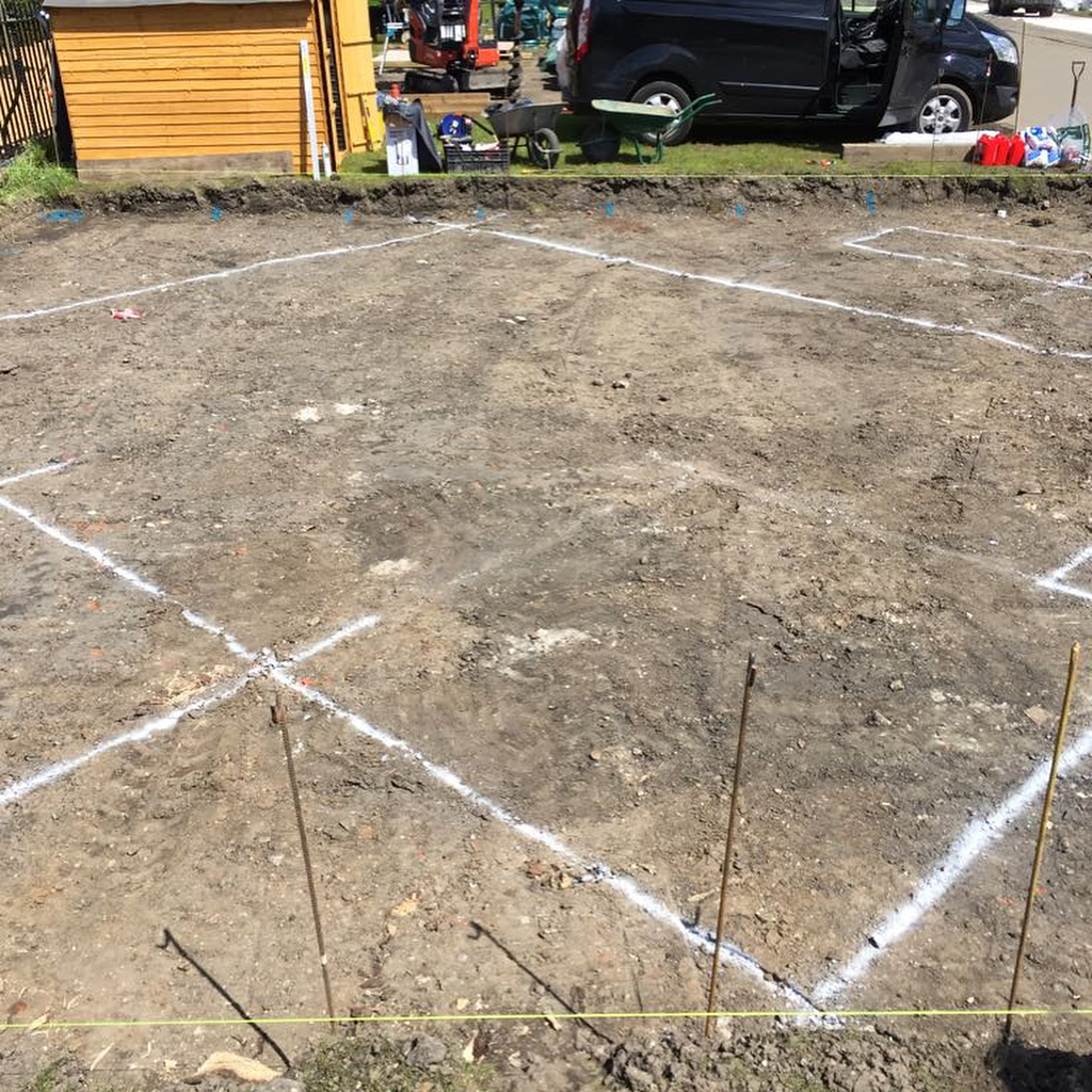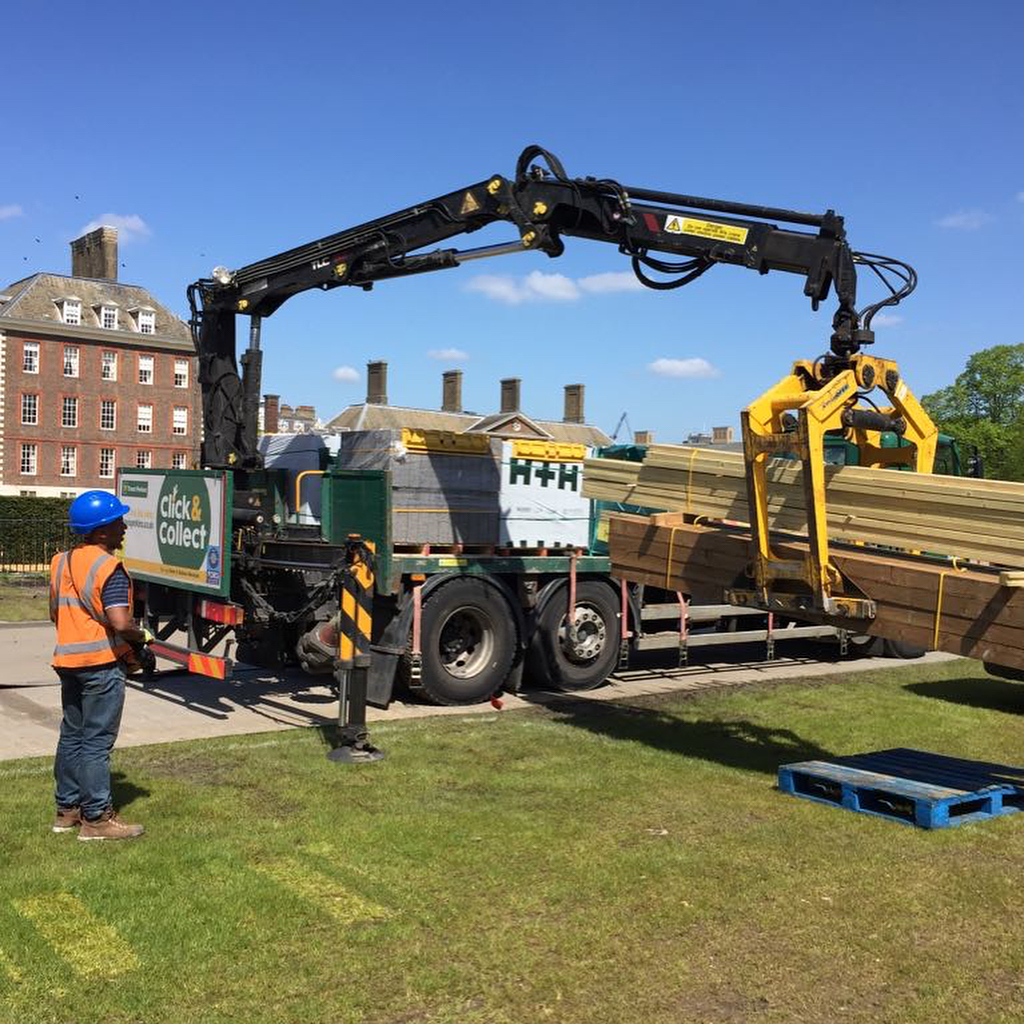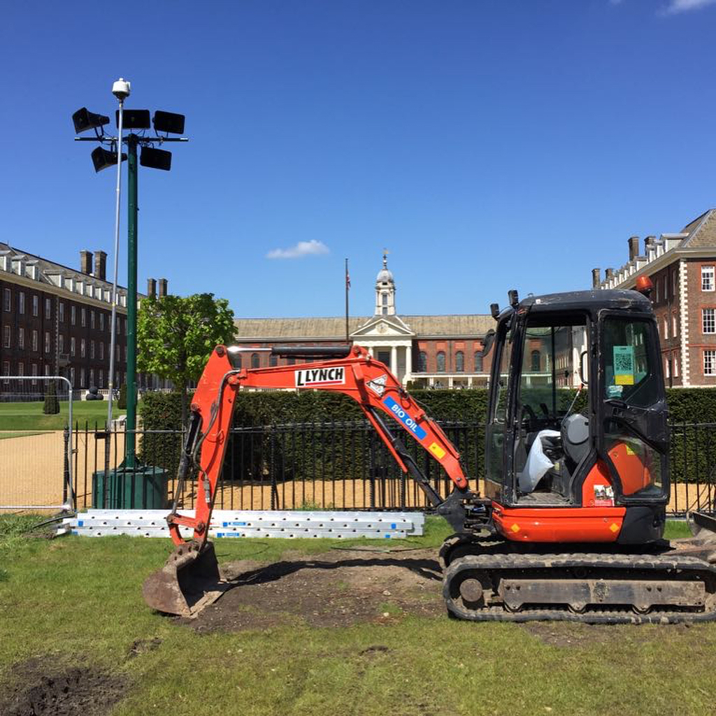 And @knchappers is off, with the help of @lynchplanthire. The @yorkshiretea is on site, spray line on the ground and #sunshine all around #rhschelsea #gardensesign #sirsimonmiltonfoundation #newwestendcompany