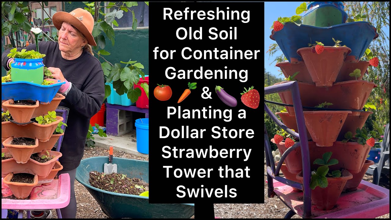 Container Gardening strawberries in dollar store containers. Easy to make using a chair, no bending.