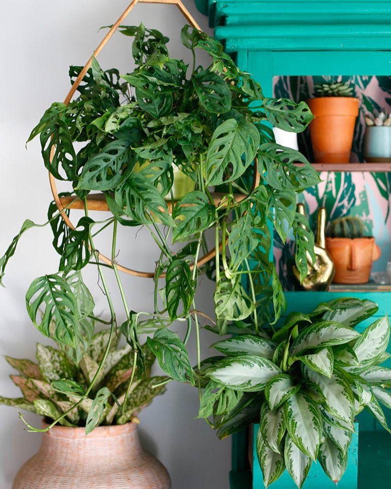 Swiss Cheese Vine (AKA Monstera obliqua or Monstera adansonii) is one of the quirkier plants we have in the studio. We love the cut outs and unpredictable shapes we find in the leaves. It’s a wonderful spiller plant that looks great in a hanging planter or sitting pretty on a shelf where its vines have room to wander. Check out our stories for a link to a plant-o-pedia written by our homie, @danaerolynhorst about how to care for your own swiss cheese vine! 🌿🌿🌿#jungalow