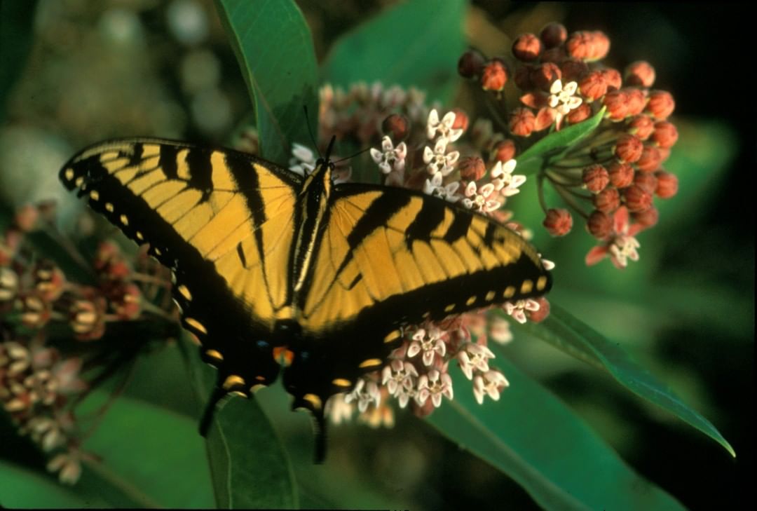 The @newenglandwildflowersociety and New Hampshire Audubon Society are co-sponsoring a special Pollinator Symposium on Sunday, October 28 in Concord, New Hampshire focused on pollinator-friendly plants. There will be workshops, talks, and break out sessions for anyone interested in learning more about the subject; registration at newenglandwild.org. Pictured: Tiger-swallowtail on Asclepias. Photo by Dan Jaffe.