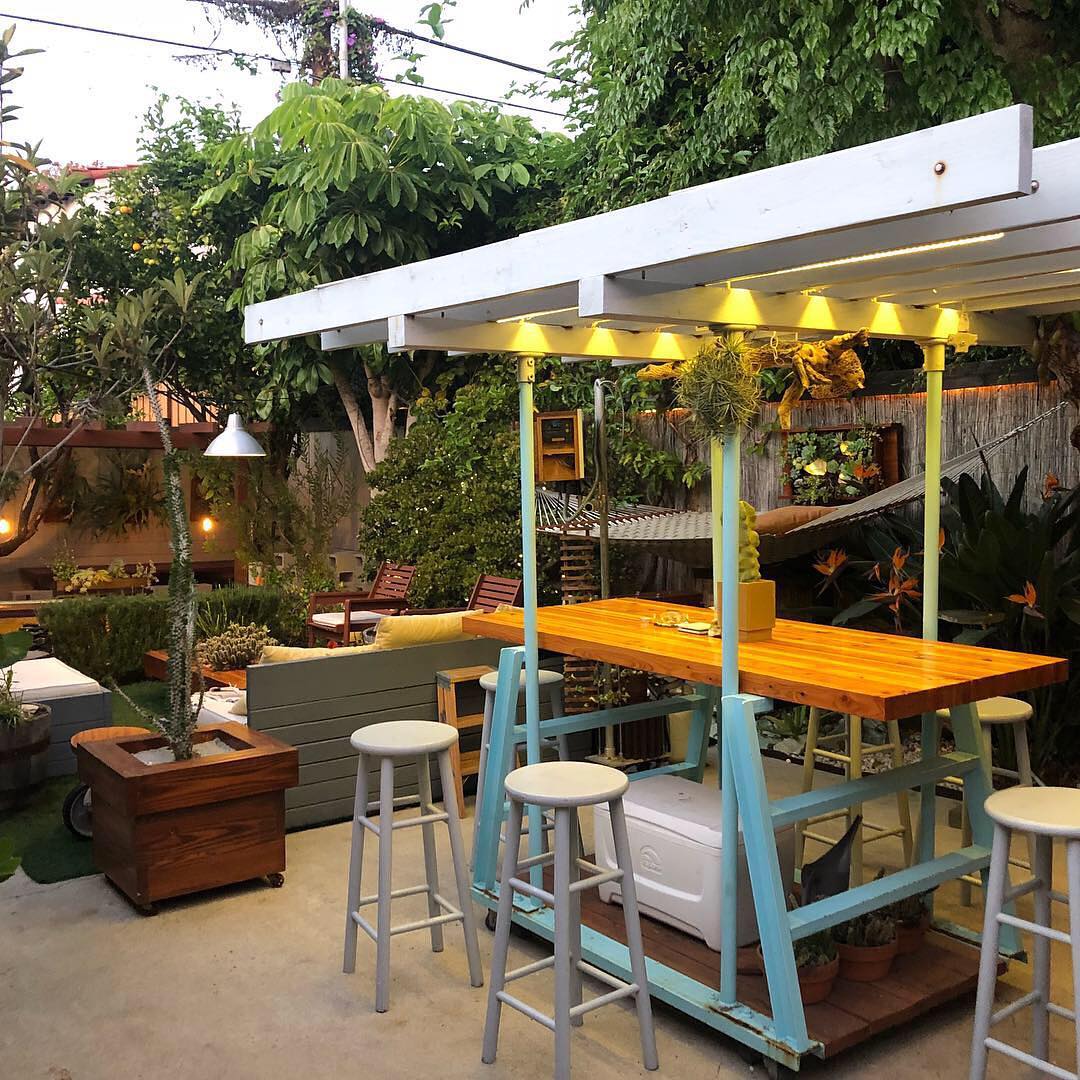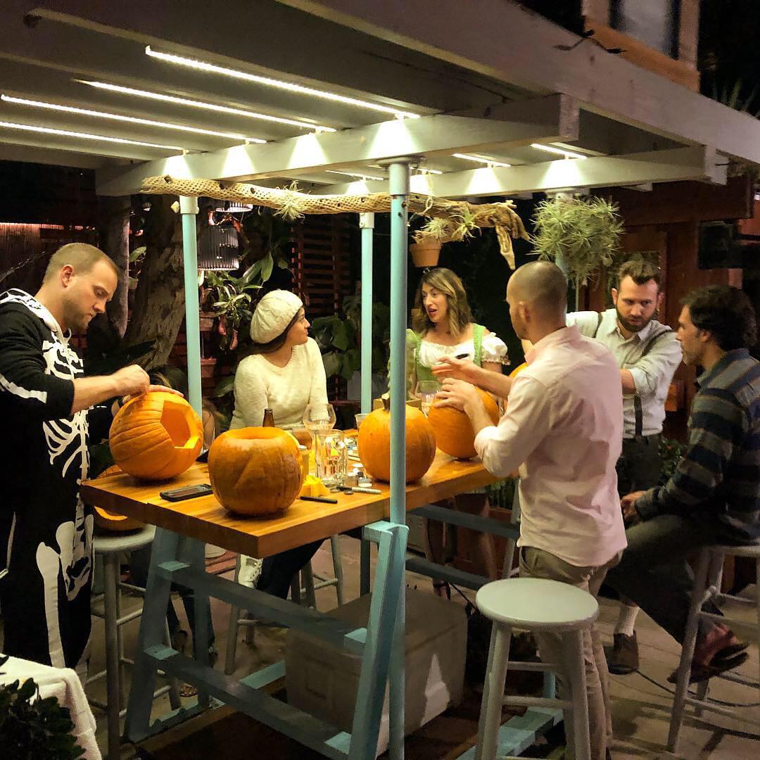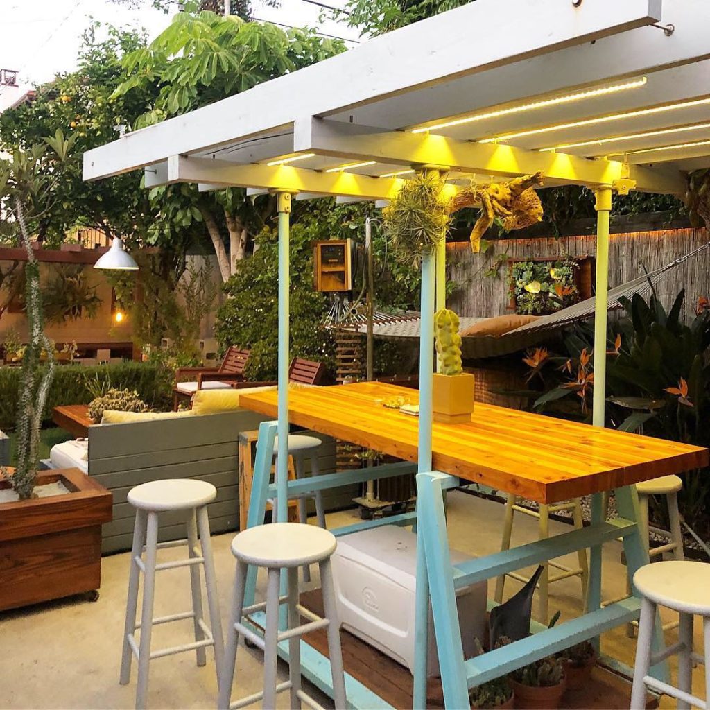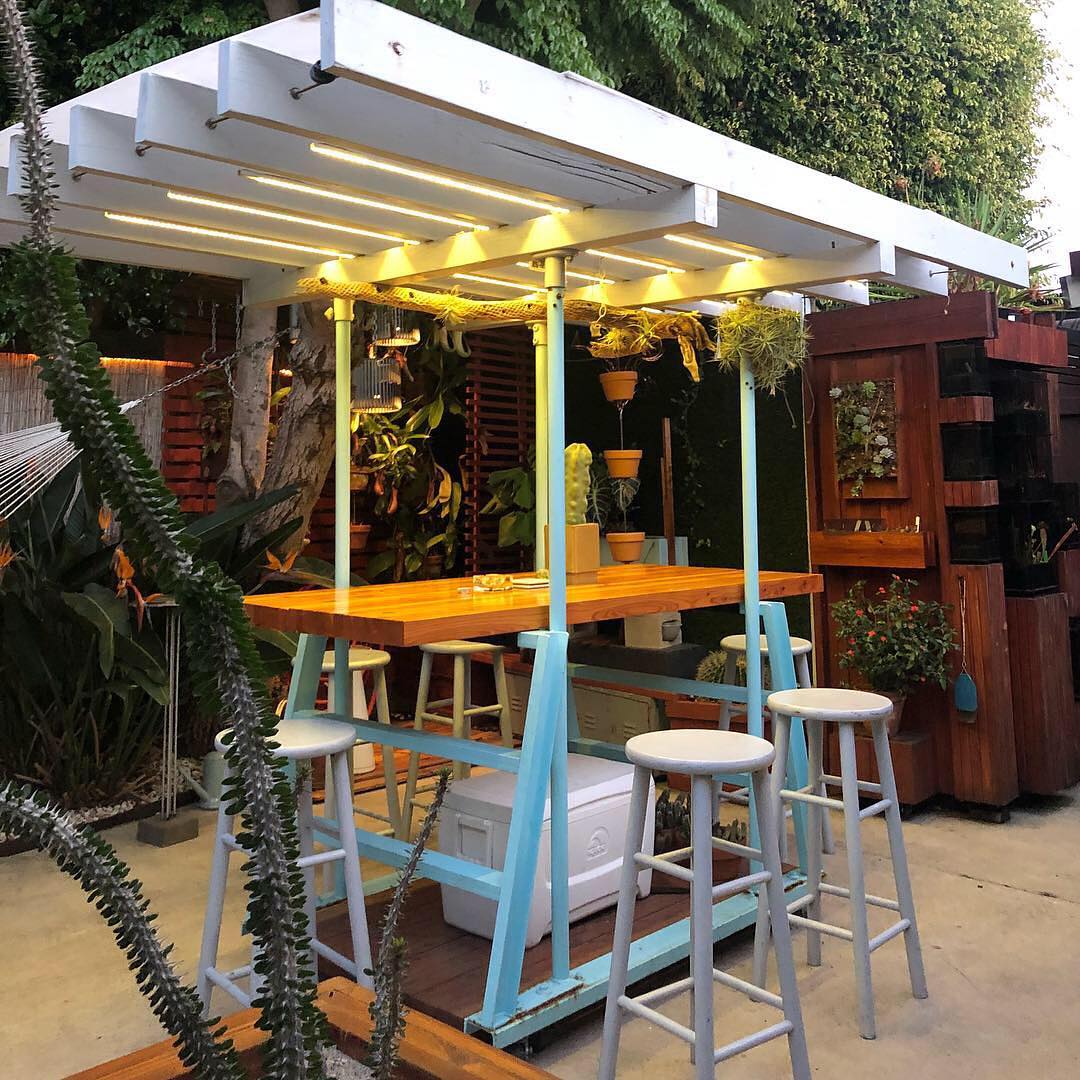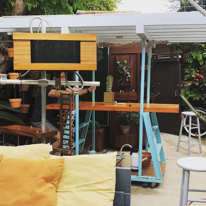 The Rolling Arbor — Two repurposed industrial stepladders connected with steel channel at base. Rolls on eight heavy duty hidden casters. Doug fir 2×6 framing up top with LED lights for night and translucent acrylic shade cover for day 🌿— Great filtered light for air plants! Removable/adjustable high table top for coffee, dinners and the occasional pumpkin carving 🎃 #rollingarbor #outdoorroom #thehorticultgarden #ryanbenoitdesign #repurposedfurniture #diy