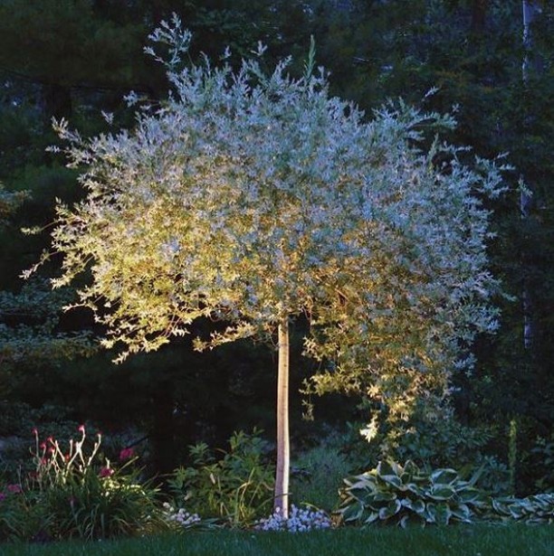 Trees with variegated foliage, such as this dappled willow (Salix ‘Hakuro Nishiki’), are especially well-suited for this theatrical lighting because the white leaves are already more visible at night.