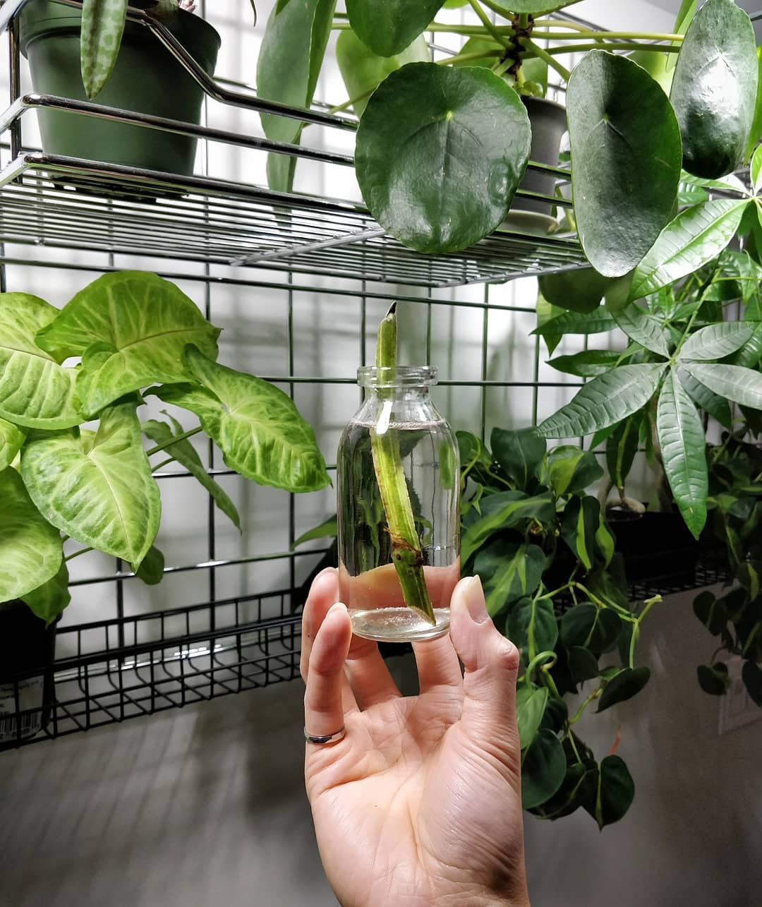 Can it be saved? My friend brought her golden pothos that she had for several years growing as a single vine. In the last few months, there seemed to be a steady decline in its vitality – losing leaves rapidly. By the time I saw it, there was just one leaf with an impressively long vine. Rescue strategy: we cut up the vine into 6″ sections, each having 2-3 nodes. I instructed her to put the sections into water in the hopes that they’ll root. And just so I could monitor the progress, I took a small section of the vine myself. Curious to see if this works – have you ever successfully sprouted a pothos vine without any leaves?