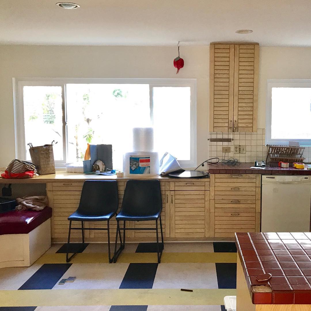 Ready for a little before and after action? This is the condo my sis @faithblakeney and I redid last year for our parents. We kept the original cabinets, but painted them and replaced the upper cabinet with open shelving. The backsplash tile from @fireclaytile and the terra-cotta porcelain floor tiles from @wayfair were major factors in updating the whole feel of the space. Surrounding the windows with a colorful hue helps to frame the view and pump up the contrast creating more dynamism in the kitchen. We put an emphasis on natural materials and chose light fixtures and furniture made from rattan and jute as a natural neutral. Our whole family meets here on Sundays and we love gathering in this space, it’s very conducive to hanging out and enjoying each other as well as my mama’s bomb-a$$ cooking 😋 😁🍴. Swipe to see the before!