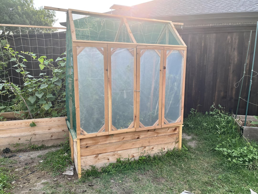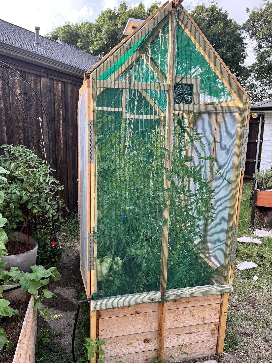 I built a garden bed cover that I’m hoping will act like a greenhouse because the Dallas heat usually kills my tomato plant. I’ve never built anything like this before, so it’s not perfect and doesn’t seem to be lowering the temp inside. Would love some advice. Zone 8a – intense heat this week!